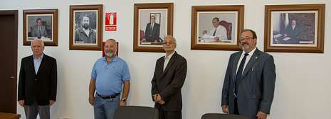 | Los alcaldes de la democracia. Desde la izquierda, ante las fotos de su etapa en la alcaldía. Antonio López Vidal, Mario Arias Mon, Bertín Deza Fernández y Argelio Fernández. Falta Ricardo Parada, que no estaba en el concello. |